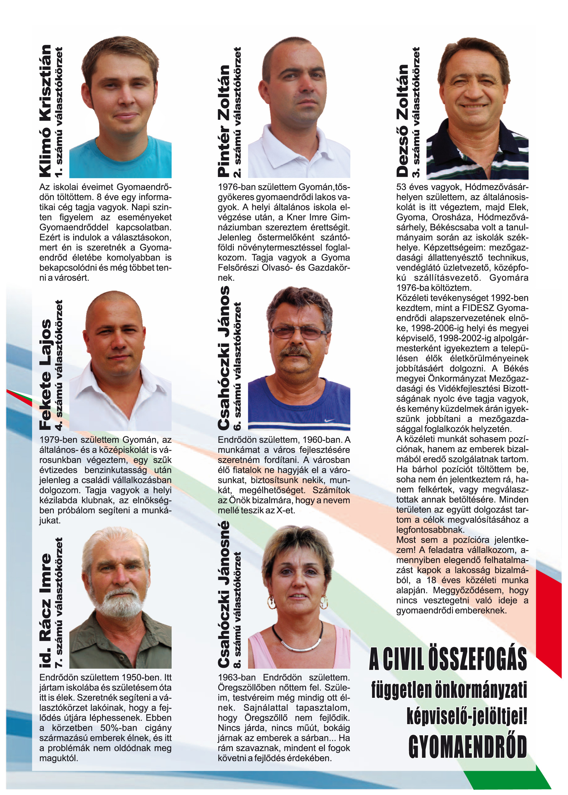 A 2010. október 3-án az önkormányzati választás alkalmával, mint a Civil Összefogás polgármester-jelöltje, számítok mindazon gyomaendrődi lakosok megtisztelő bizalmára és szavazatára: