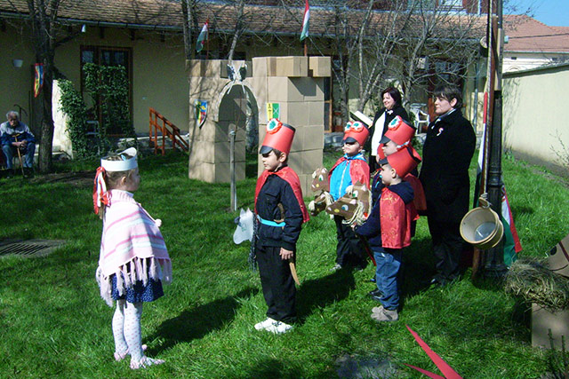 A március 15-ei nemzeti ünnepre emlékezve március 13-án a nagycsoportosok egy része előadta a "Jönnek a huszárok" c. mesét a korhűen feldíszített bölcsőde udvarán. A kicsik és nagyok legnagyobb örömére ellátogatott intézményünkbe a budapesti Cirkalap Gólyalábas Kompánia, akik interaktív toborzó produkciójukkal emlékezetessé varázsolták a napsütéses délelőttöt mindannyiunk számára.