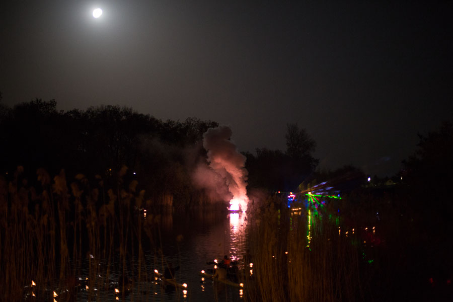 Ezután 29 kajakos evezett köréjük, akik hajóikon egy-egy mécsessel nagyon szép fényparádéval szórakoztatták a nézőket.