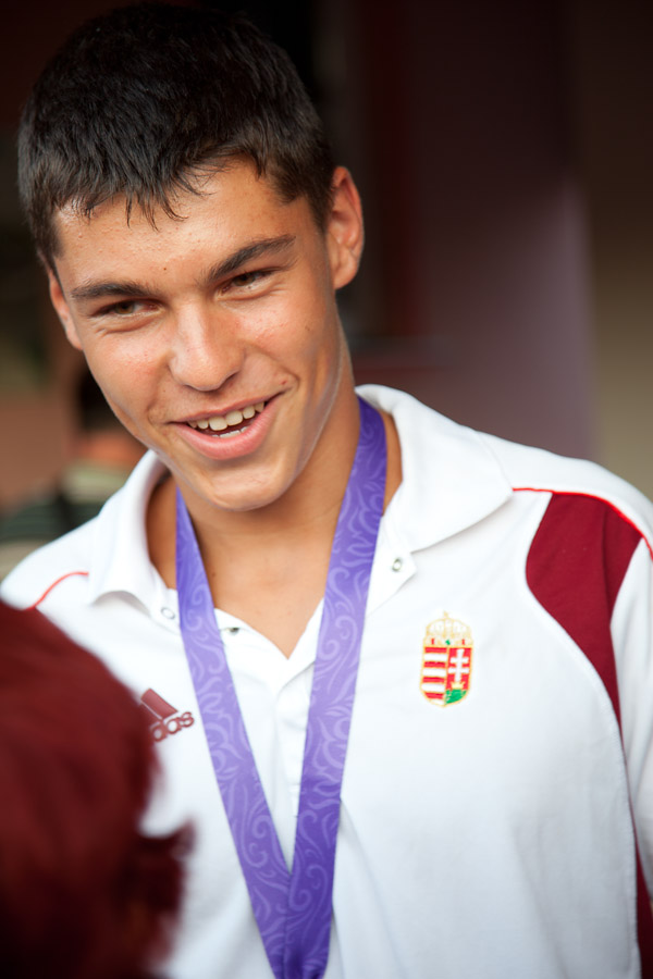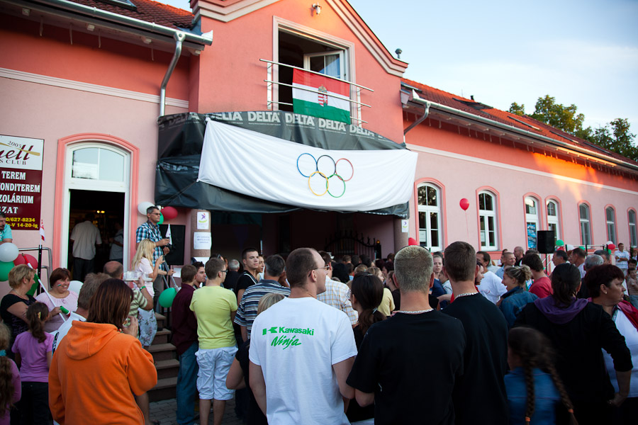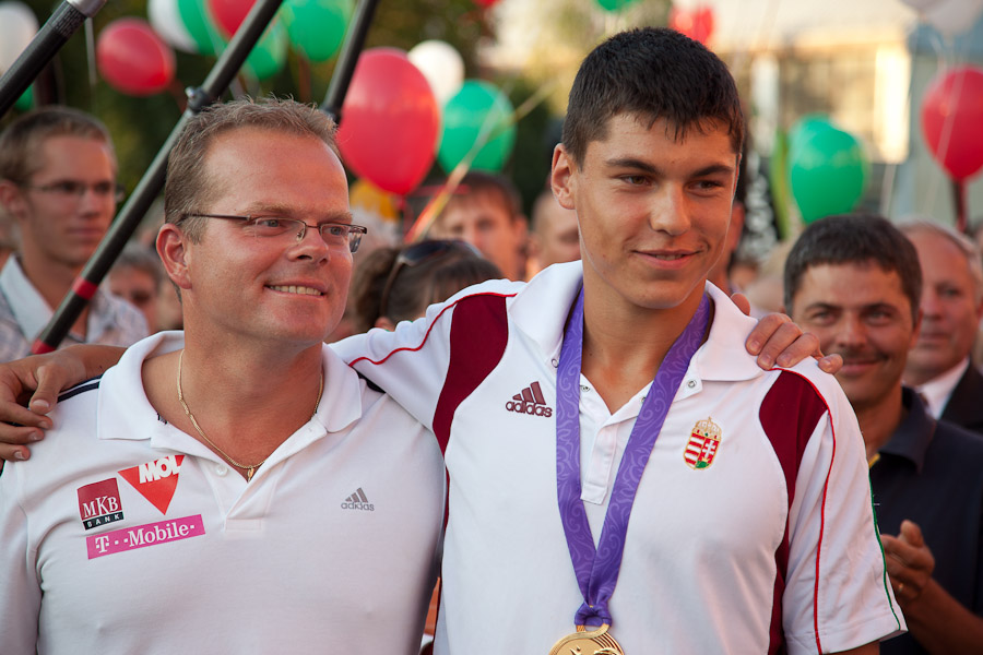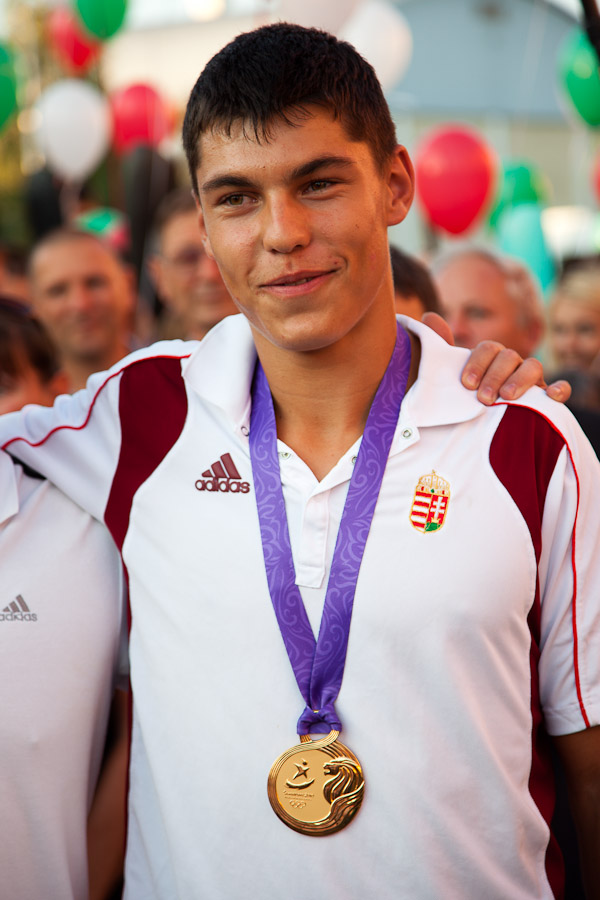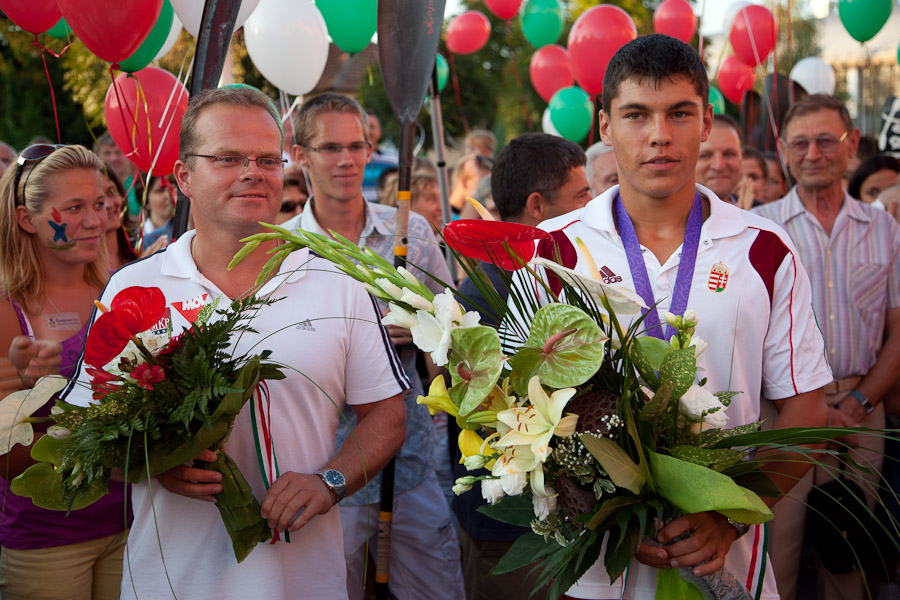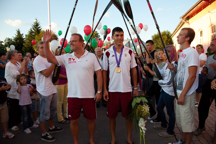 Gellai Imre, a Körös Kajak Sportegyesület elnöke izgatottan várta a Kner téren az ezres létszámú tömeggel, hogy Budapestről megérkezzen az ifjú bajnok. A kajakos evezőkből vont diadalív alatt átvonuló sportolót és edzőjét, Kovács Gábort Gellai Imre köszöntötte, ill. virággal ajándékozták meg Sanyit és edzőjét, Kovács Gábort. A jelenlevők kivetítőn nézhették meg a győztes futamot, majd Sanyi autogramot osztogatott a lelkes rajongóknak. A szavak helyett azonban meséljenek az eseményről készült képek, ill. időközben elkészült a 21 perces HD dokumentumfilm is a megérkezésről.