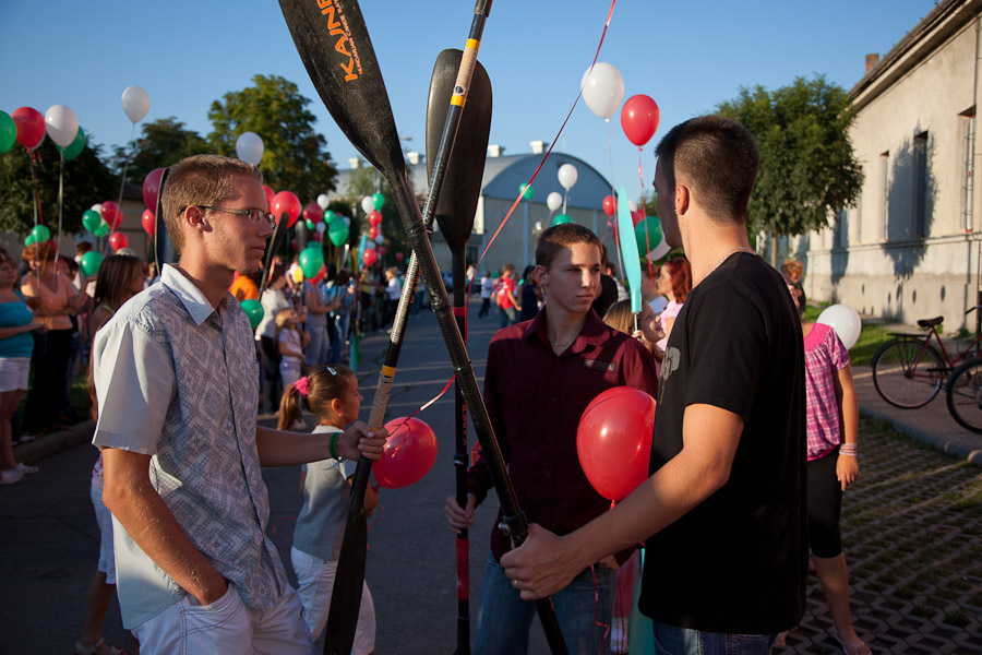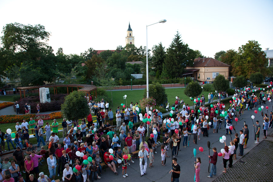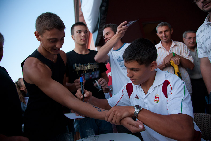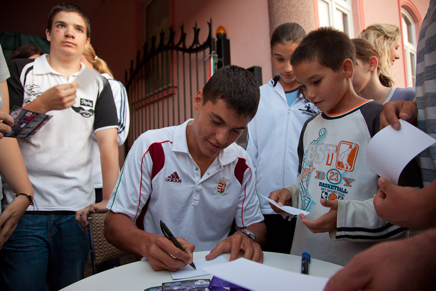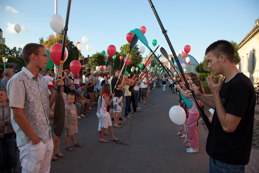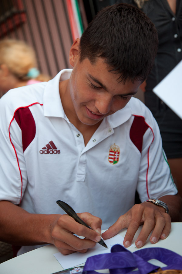 Gellai Imre, a Körös Kajak Sportegyesület elnöke izgatottan várta a Kner téren az ezres létszámú tömeggel, hogy Budapestről megérkezzen az ifjú bajnok. A kajakos evezőkből vont diadalív alatt átvonuló sportolót és edzőjét, Kovács Gábort Gellai Imre köszöntötte, ill. virággal ajándékozták meg Sanyit és edzőjét, Kovács Gábort. A jelenlevők kivetítőn nézhették meg a győztes futamot, majd Sanyi autogramot osztogatott a lelkes rajongóknak. A szavak helyett azonban meséljenek az eseményről készült képek, ill. időközben elkészült a 21 perces HD dokumentumfilm is a megérkezésről.