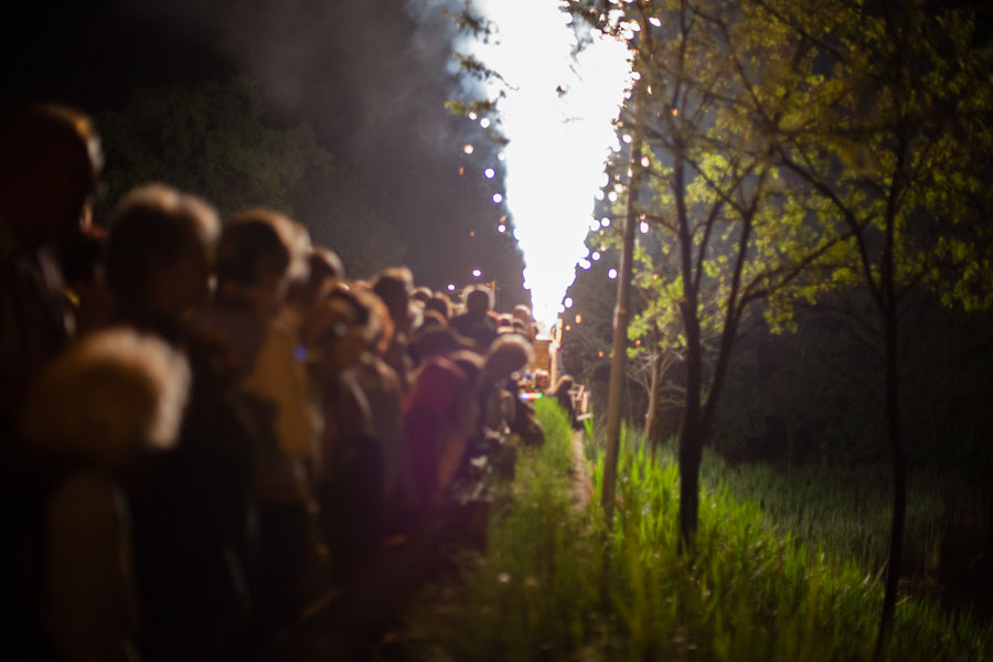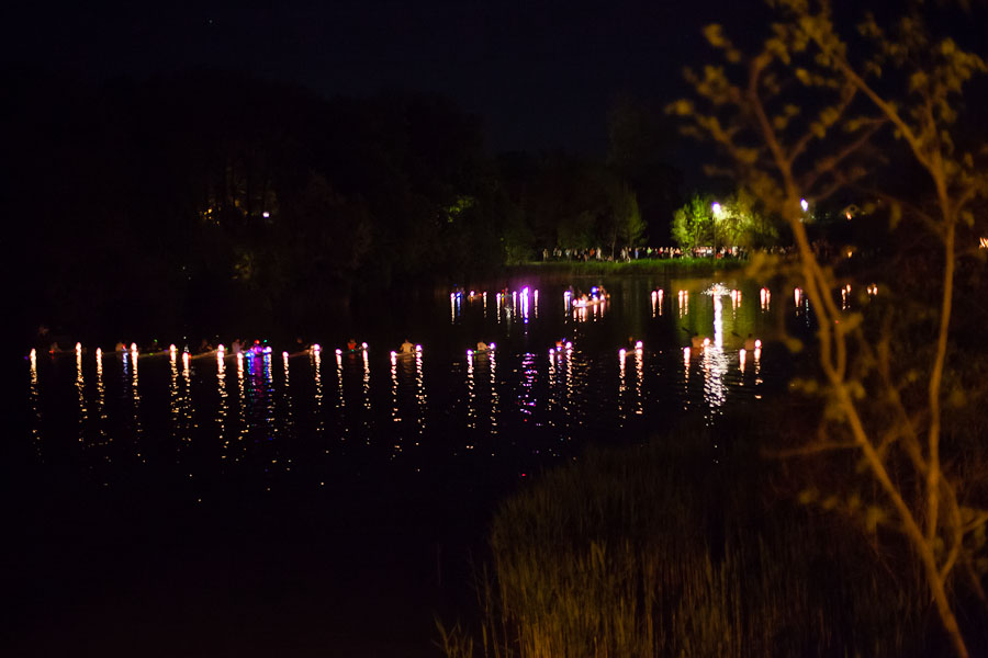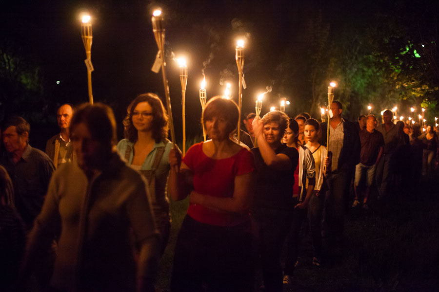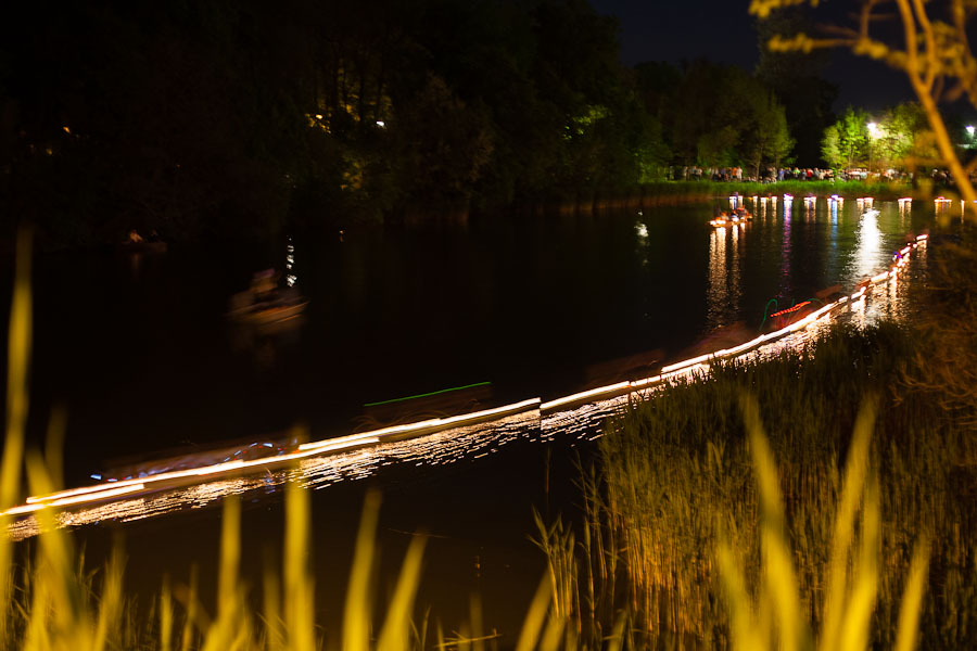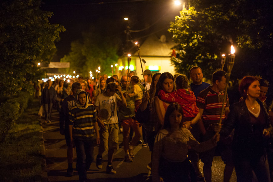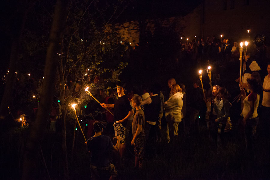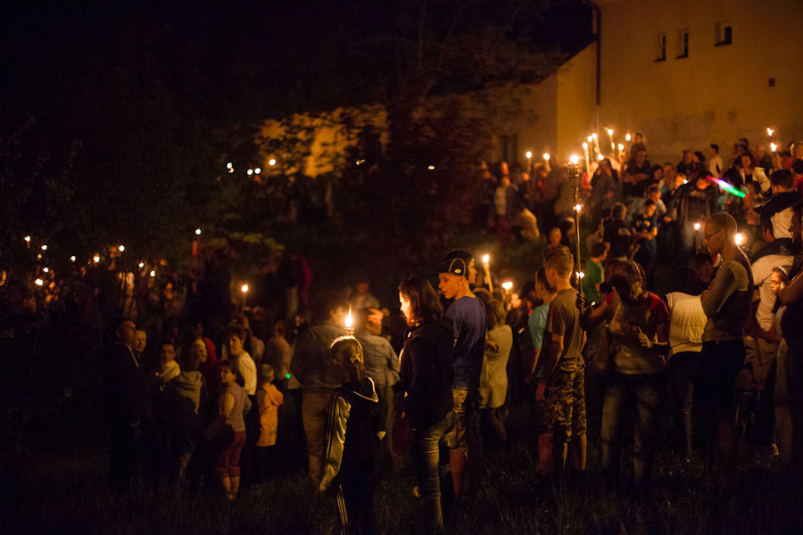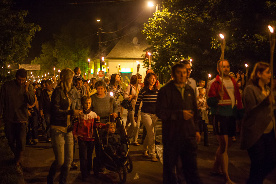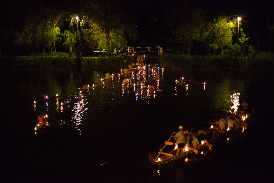 Az éj beköszöntével hangulatos fáklyás felvonulás vette kezdetét, a Színfolt Mazsorett Csoport vezetésével. Gyomaendrőd éjszakája soha nem látott látványban részesült: az égő fáklyák százai, netán ezrei fényözönbe burkolták a menet útvonalát, ami a Hősök útját követve a Kner emléktér mellett elhaladva a Hantoskerti holtág partjára vezetett. Ott újabb bemutató vette kezdetét: a sárkányhajóval felvezetett, a holtág sötét vizén látványos alakzatokban felúszó kivilágított körös-kajakos kenuk izzó fénypontjai megkapó látványt nyújtottak. A zenei aláfestésre pompásan koreografált bemutató látványos tűzijátékkal és görögtűzzel zárult. Valami olyasmit láthattak a jelenlevők, amit Gyomaendrőd életében még soha. A fáklyás felvonulást és a zenés vízi játékot sikerült gyönyörű fotósorozattal is megörökítenünk, ezért az erről szóló képgalériánk megtekintése erősen ajánlott.
