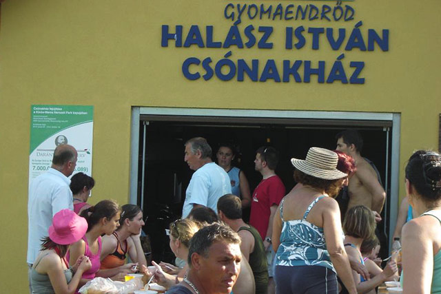 Visszaérve a hosszú és kimerítő evezésből a csónakháznál babgulyással enyhítették éhségüket a megfáradt evezősök.