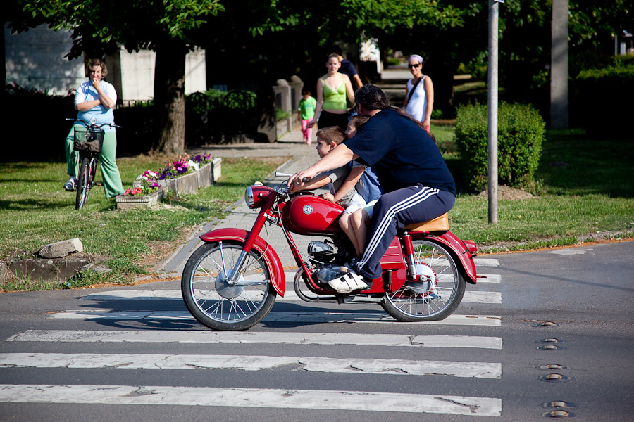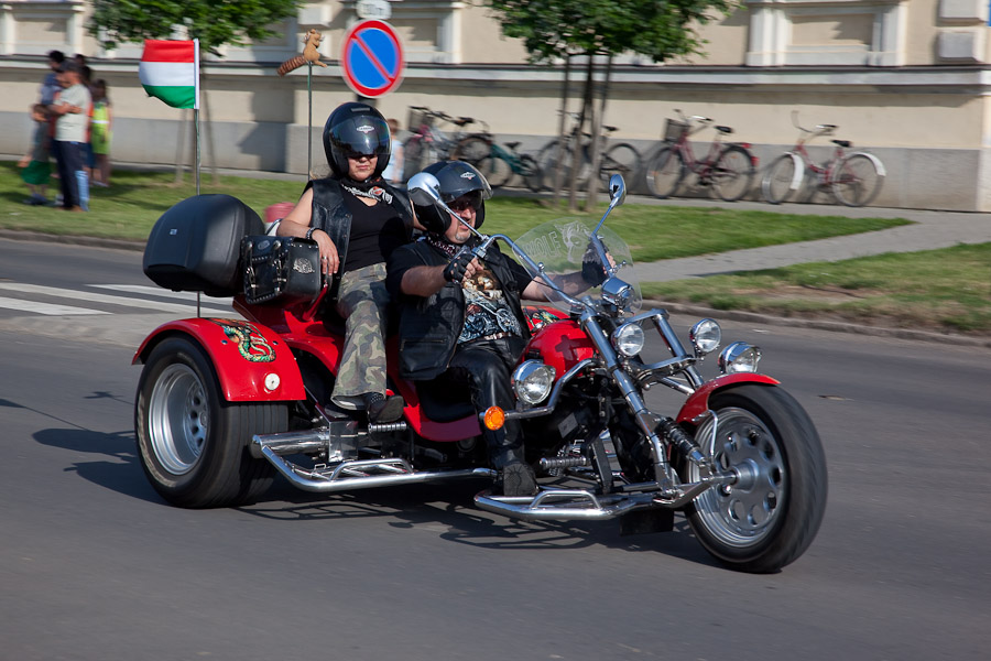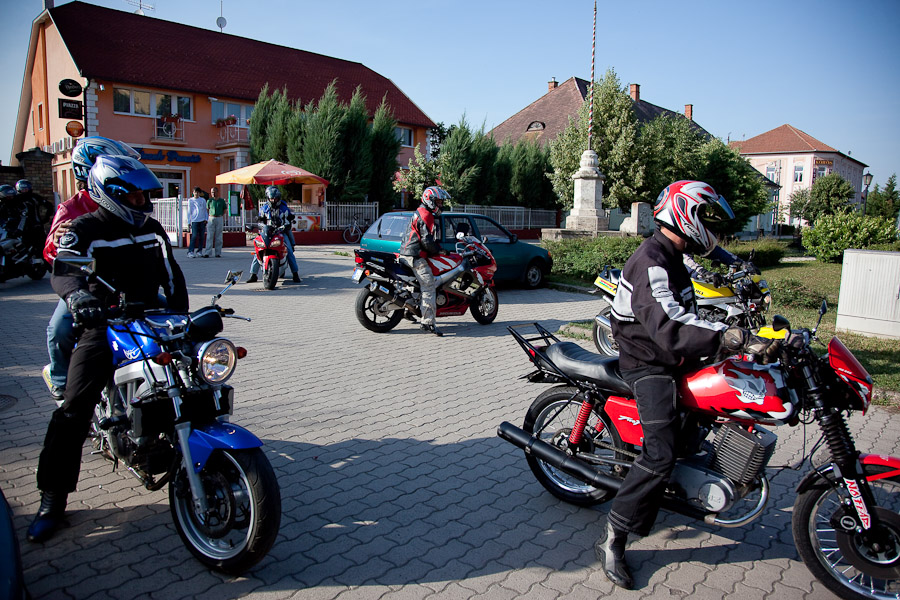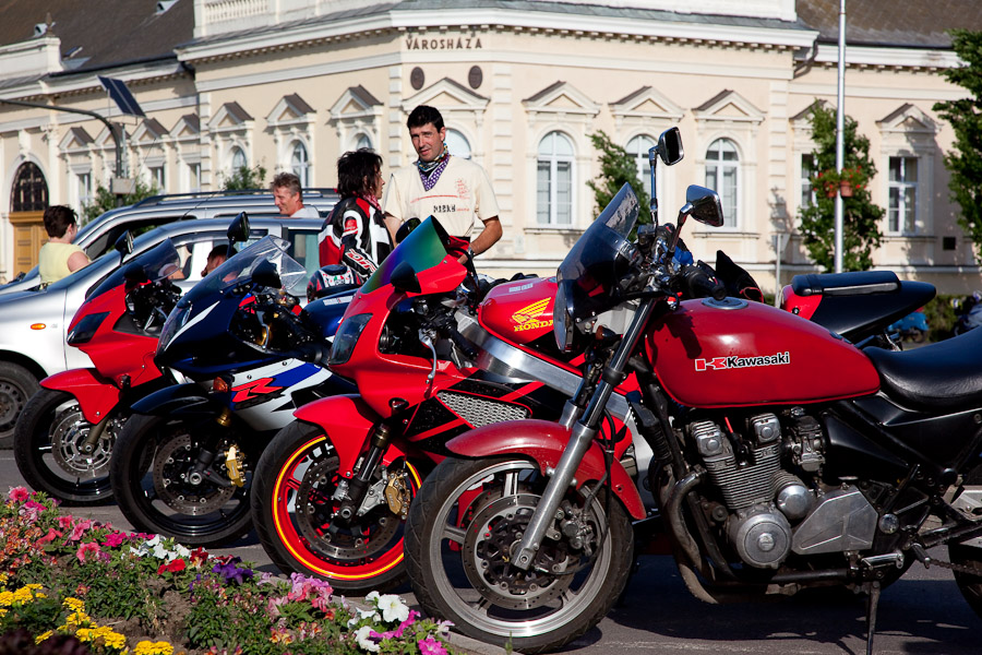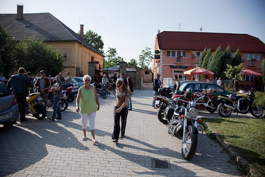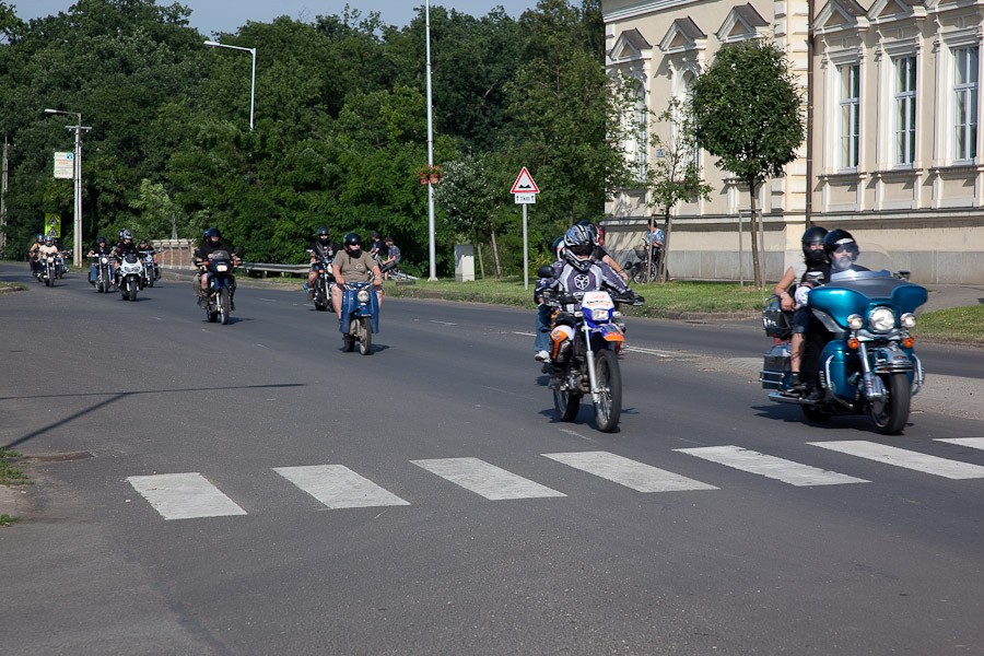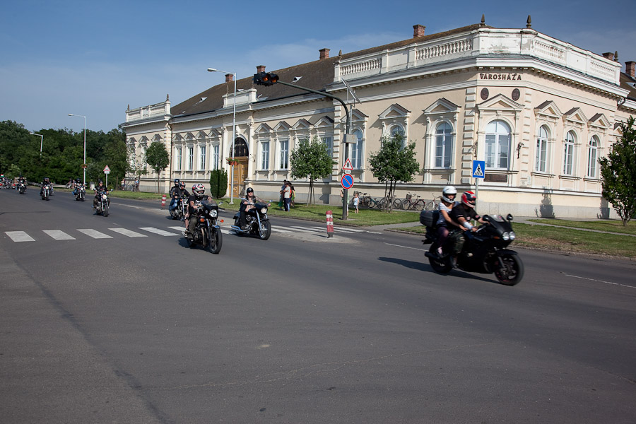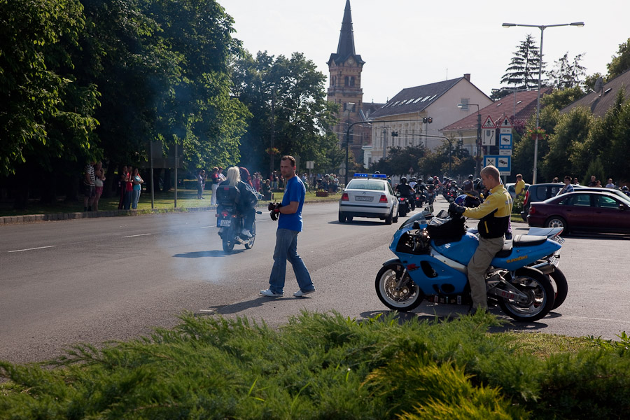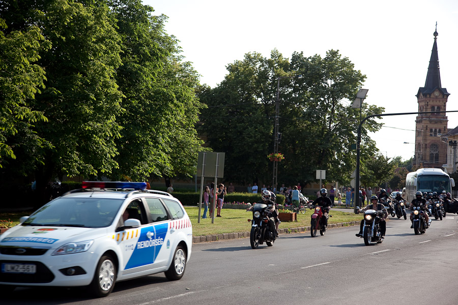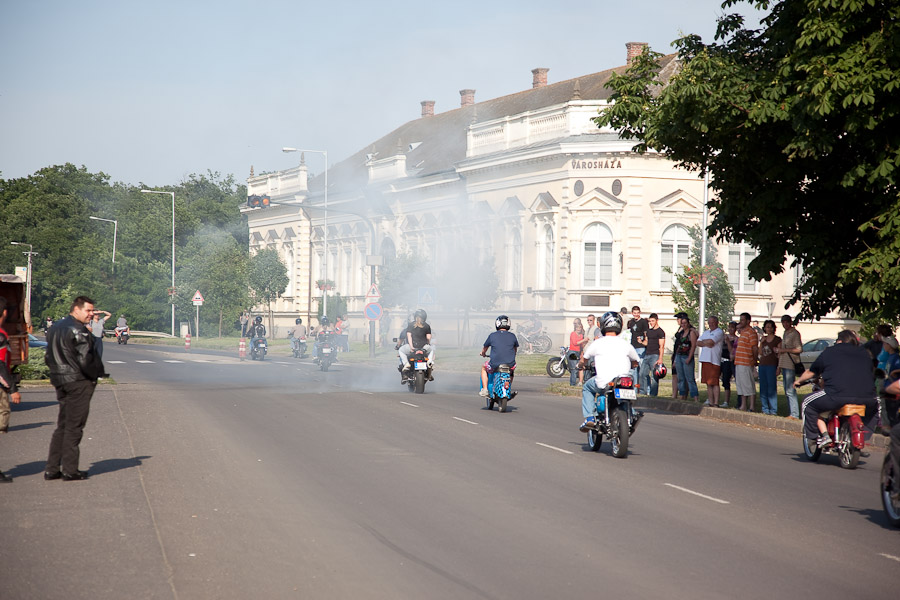The pinnacle of the day's events was the motorbike parade traditionally timed at 5 p.m. The army of motorcycles starting from the Liget Thermal Bath after leaving the main square crossed the town to hurtle towards Endrőd then after a long lap arrived back to the cool shady trees of the Elizabeth Park. The spectacular parade also gives opportunity to the inhabitants of the town to behold the miracle bikes in movement.