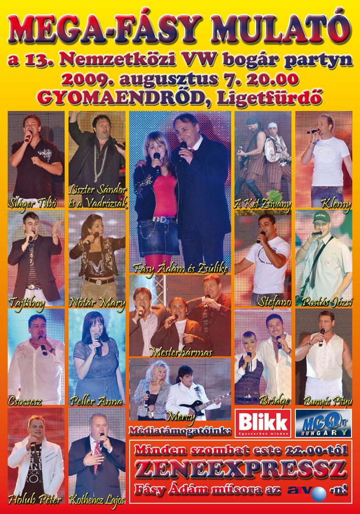2009. augusztus 7-én, pénteken, 20 órai kezdettel, négy órás élő koncertre várunk mindenkit Gyomaendrődre, a Ligetfürdőbe, ahol a 13. Nemzetközi Bogártalálkozó keretén belül lép fel a Fásy Mulató.