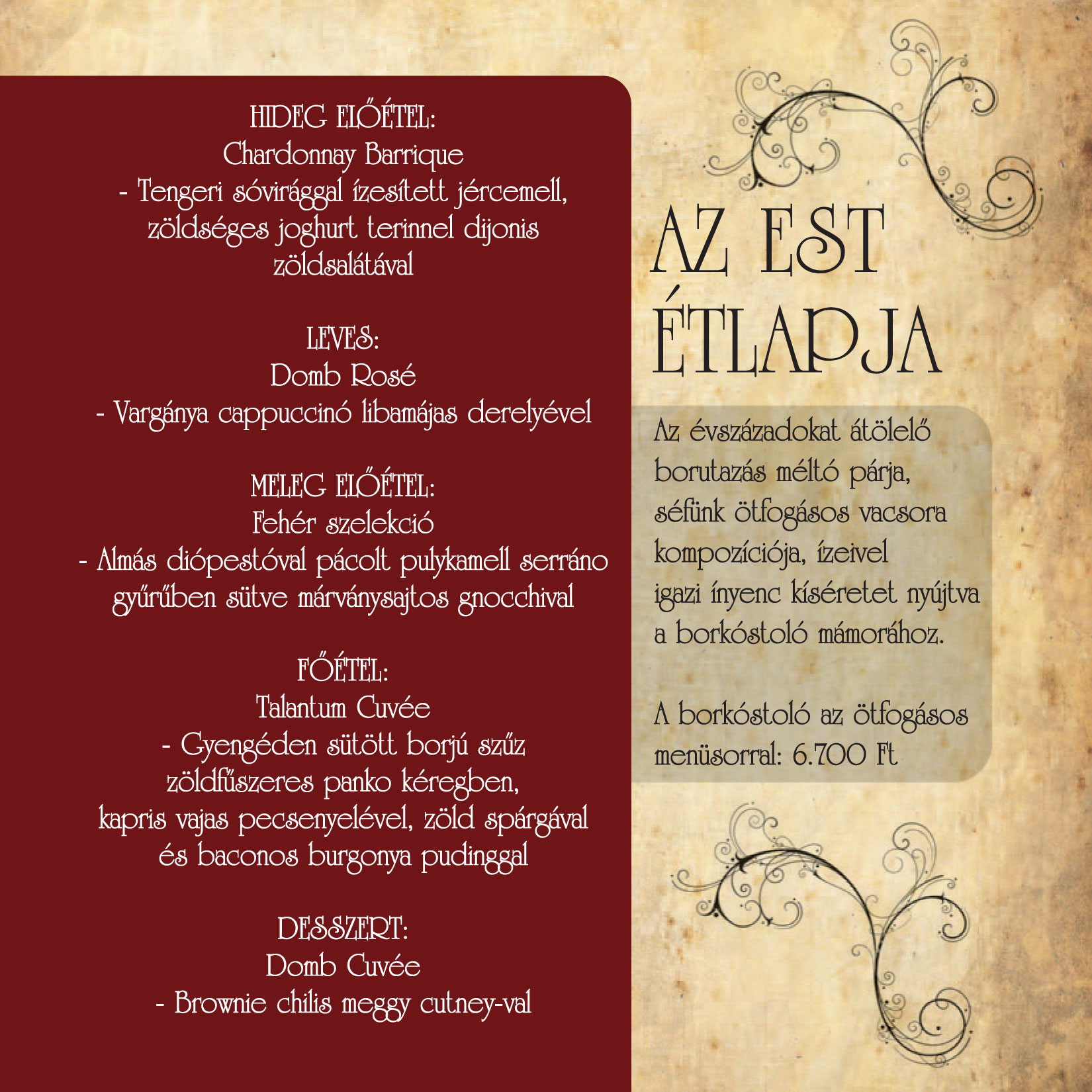 Az évszázadokat átölelő borutazás méltó párja, séfünk ötfogásos vacsora kompozíciója, ízeivel igazi ínyenc kíséretet nyújtva a borkóstoló mámorához.