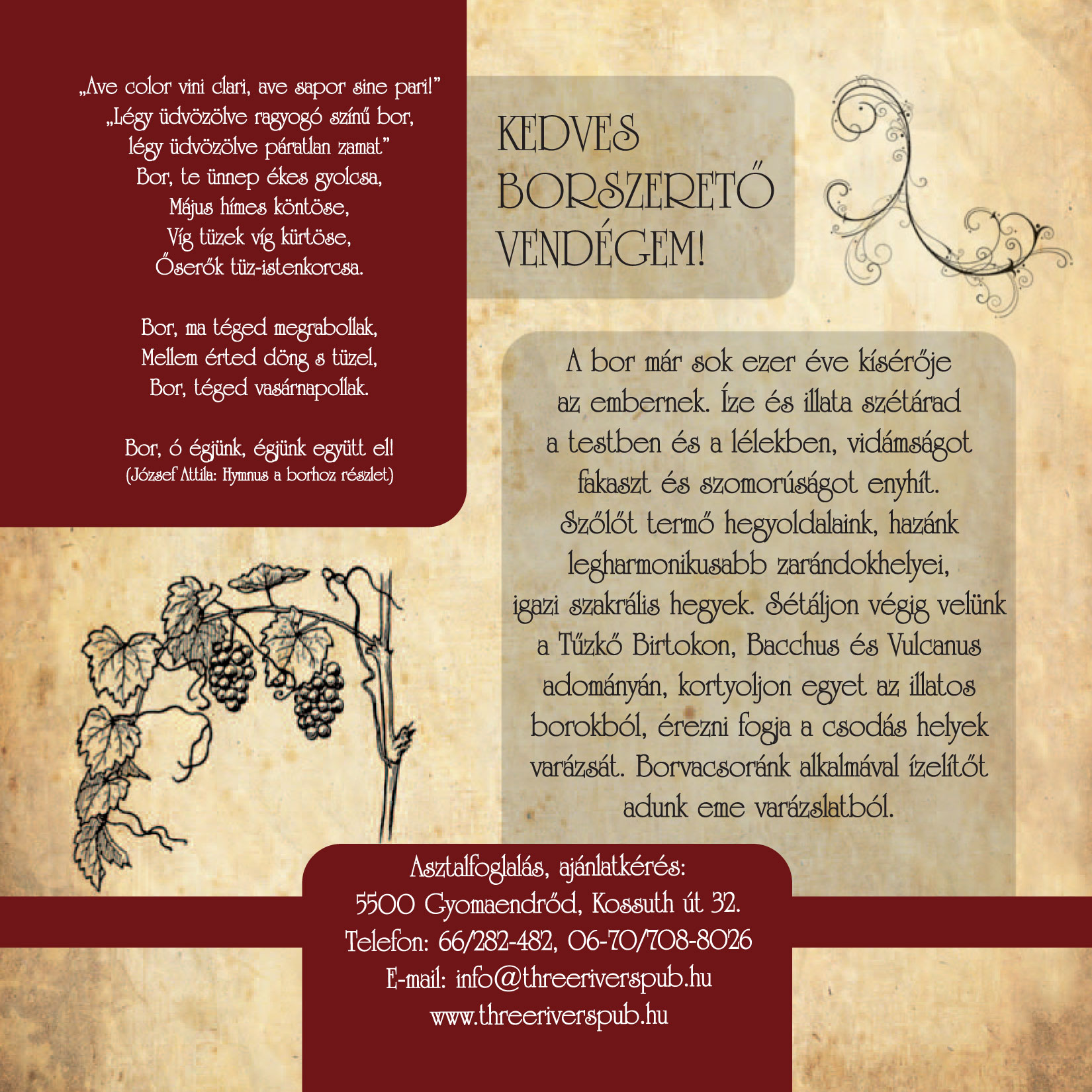 A bor már sok ezer éve kísérője az embernek. Íze és illata szétárad a testben és a lélekben, vidámságot fakaszt és szomorúságot enyhít. Szőlőt termő hegyoldalaink, hazánk legharmonikusabb zarándokhelyei, igazi szakrális hegyek. Sétáljon végig velünk a Tűzkő Birtokon, Bacchus és Vulcanus adományán, kortyoljon egyet az illatos borokból, érezni fogja a csodás helyek varázsát. Borvacsoránk alkalmával ízelítőt adunk eme varázslatból.