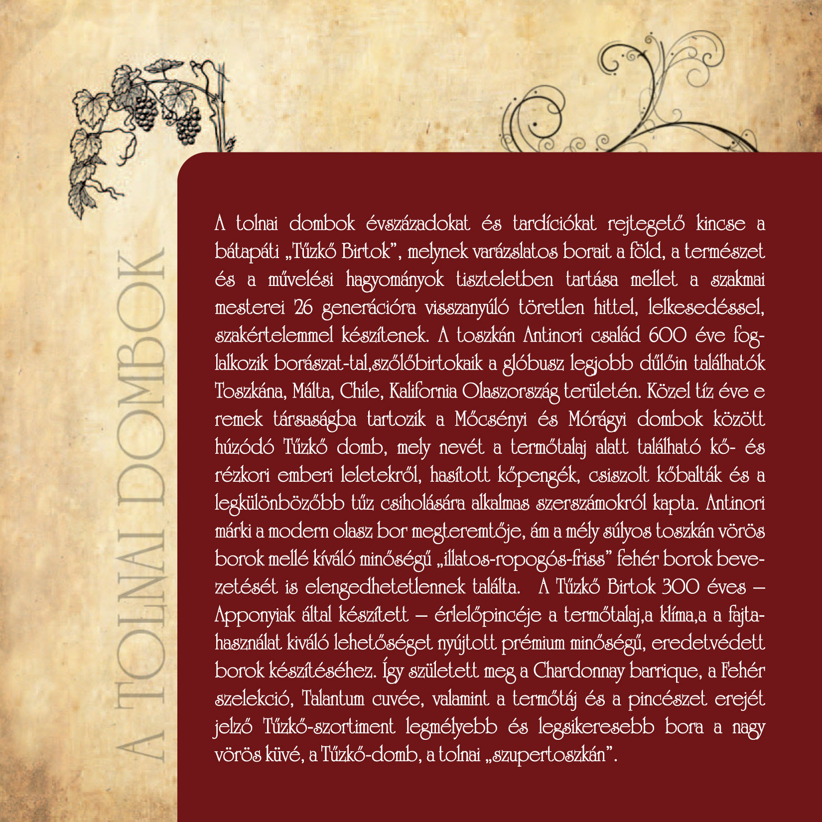A tolnai dombok évszázadokat és tardíciókat rejtegető kincse a bátapáti „Tűzkő Birtok”, melynek varázslatos borait a föld, a természet és a művelési hagyományok tiszteletben tartása mellet a szakmai mesterei 26 generációra visszanyúló töretlen hittel, lelkesedéssel, szakértelemmel készítenek. A toszkán Antinori család 600 éve foglalkozik borászattal,szőlőbirtokaik a glóbusz legjobb dűlőin találhatók Toszkána, Málta, Chile, Kalifornia Olaszország területén. Közel tíz éve e remek társaságba tartozik a Mőcsényi és Mórágyi dombok között húzódó Tűzkő domb, mely nevét a termőtalaj alatt található kő- és rézkori emberi leletekről, hasított kőpengék, csiszolt kőbalták és a legkülönbözőbb tűz csiholására alkalmas szerszámokról kapta. Antinori márki a modern olasz bor megteremtője , ám a mély súlyos toszkán vörös borok mellé kíváló minőségű „illatos-ropogós-friss „fehér borok bevezetését is elengedhetetlennek találta. A Tűzkő Birtok 300 éves -Apponyiak által készített- érlelőpincéje a termőtalaj,a klíma,a a fajtahasználat kiváló lehetőséget nyújtott prémium minőségű, eredetvédett borok készítéséhez. Így született meg a Chardonnay barrique, a Fehér szelekció, Talantum cuvée valamint a termőtáj és a pincészet erejét jelző Tűzkő-szortiment legmélyebb és legsikeresebb bora a nagy vörös küvé, a Tűzkő-domb, a tolnai „szupertoszkán”.