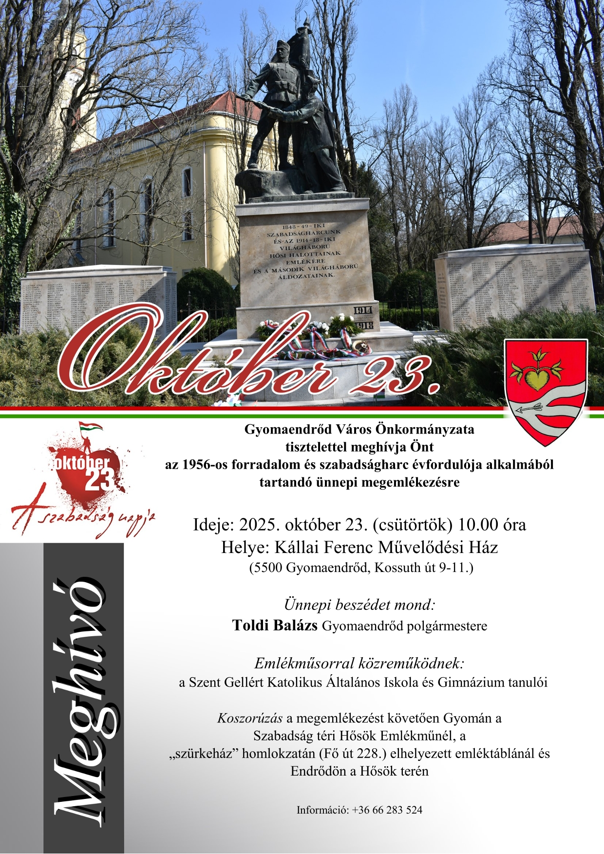 Gyomaendrőd Város Önkormányzata tisztelettel meghívja Önt az 1956-os forradalom és szabadságharc évfordulója alkalmából tartandó ünnepi megemlékezésre