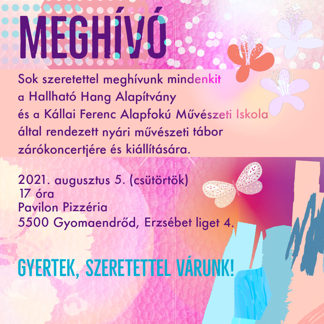 Sok szeretettel meghívunk mindenkit a Hallható Hang Alapítvány és a Kállai Ferenc Alapfokú Művészeti Iskola által rendezett nyári művészeti tábor zárókoncertjére és kiállítására.