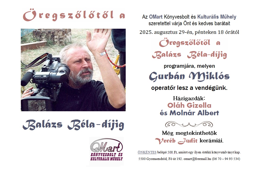 Az OMart Könyvesbolt és Kulturális Műhely szeretettel várja Önt és kedves barátait 2025. augusztus 29-én, pénteken 18 órától Öregszőlőzől a Balázs Béla-díjig programjára, melyen Gurbán Miklós oparatőr lesz a vendégünk.
