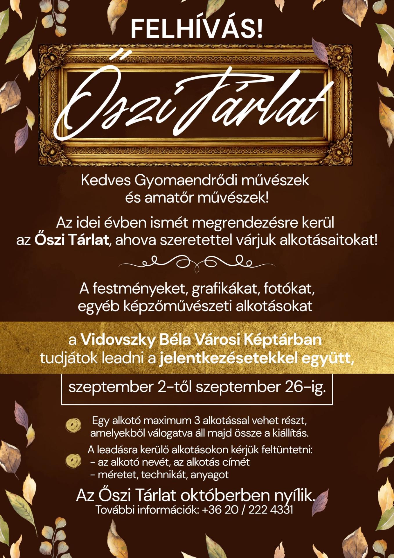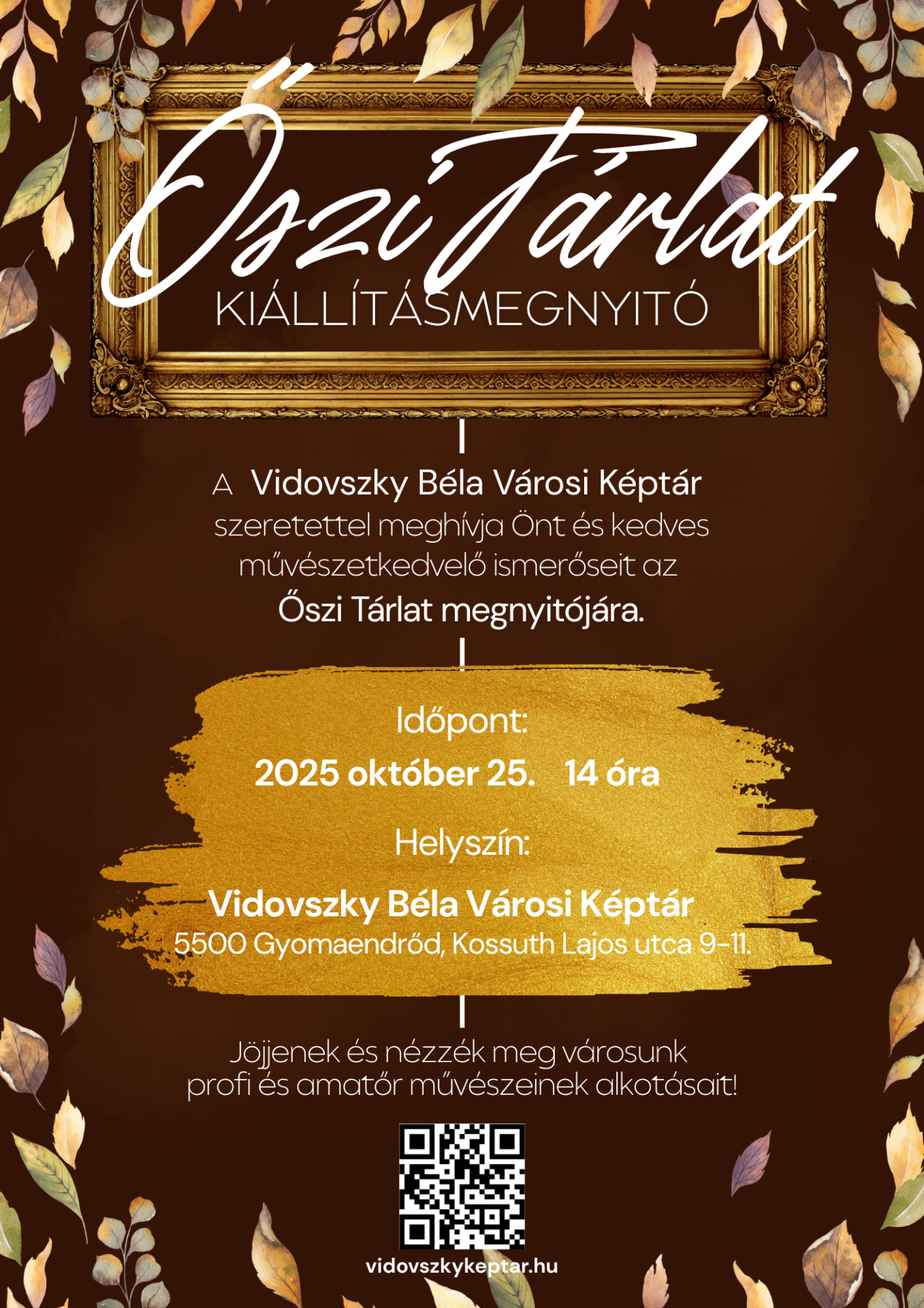 A Vidovszky Béla Városi Képtár szeretettel meghívja Önt és kedves művészetkedvelő ismerőseit az Őszi Tárlat megnyitójára.