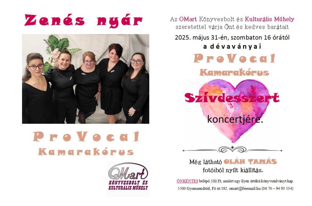 Az OMart Könyvesbolt és Kulturális Műhely szeretettel várja Önt és kedves barátait 2025. május 13-én szombaton, 16 órától " a dévaványai ProVocal Kamarakórus Szívdesszert koncertjére.