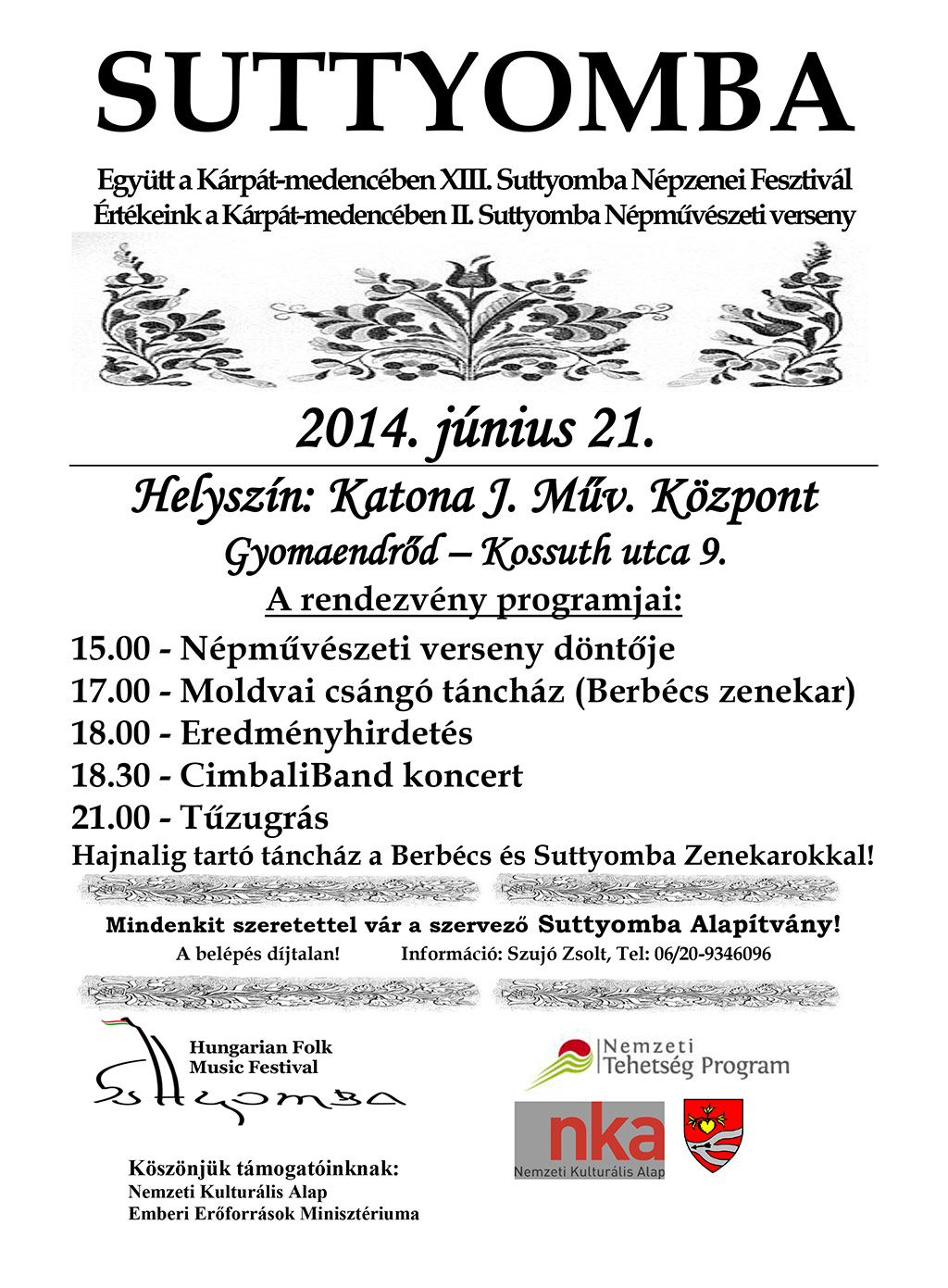 A Suttyomba Alapítvány immár 13. alkalommal szervezi meg népzenei fesztiválját Gyomaendrődön, 2014. június 21.-én a Katona József Művelődési Központban. A rendezvényhez ismét kapcsolódik azon népművészeti verseny, amelyet az alapítvány 2013. évben nagy sikerrel szervezett meg a megyei általános és középiskolások részére. Az „Értékeink a Kárpát-medencében” Suttyomba Népművészeti Verseny idén második alkalommal kerül megrendezésre, amelyre idén is nagy érdeklődés mutatkozik.