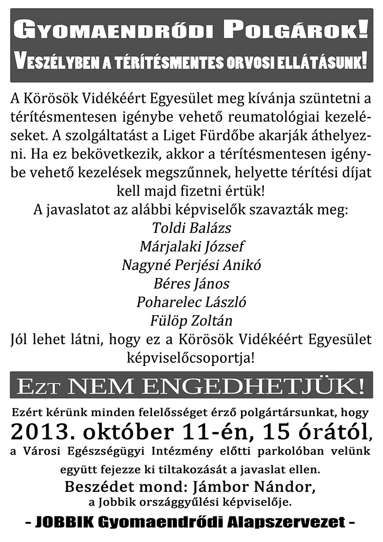 Ezért kérjük minden felelősséget érző polgártársunkat, hogy 2013. október 11-én 15 órától a Városi Egészségügyi Intézmény előtti parkolóban velünk együtt fejezze ki a tiltakozását a javaslat ellen.